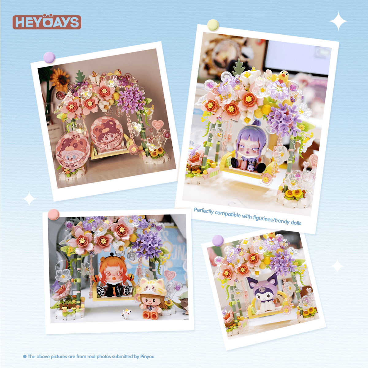 Romantic flower-arch build with a moving swing – Recreate a dreamy Blooming Swing scene full of layered blossoms and metallic petals plus a working hanging swing. Finished piece is a charming desktop décor or photo prop.