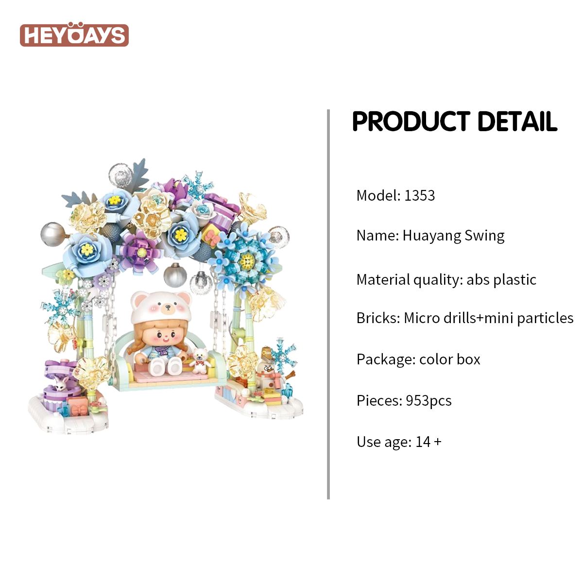 Build a pastel dreamscape with the LOZ Mini Blocks Blooming Swing Flower Arch (1353). This 953-piece micro-brick set assembles a lavish floral arch packed with layered roses, blossoms and metallic-plated petals. The central bench really swings, and the included LED flower light components add a soft glow to shelves, desks or dressers. Designed for builders 14+ who enjoy detailed flower bouquet building kits, the finished model doubles as elegant home décor and a memorable gift.
