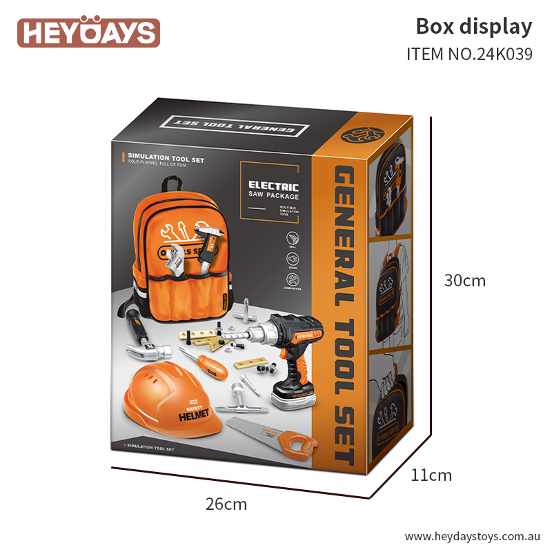 - Set Includes: 1 tool backpack, 1 helmet, 1 electric drill with 3 drill bits, 1 hammer, 1 screwdriver, 1 hand saw, 1 wrench, 1 measure, 4 wood pieces, 6 hex screws, 6 hex nuts, and more