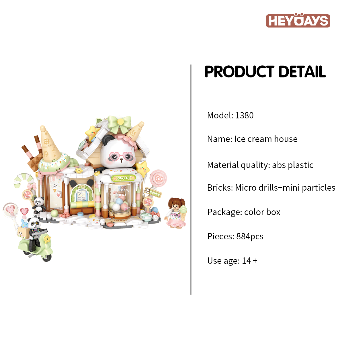 Serve up sweetness with this charming Ice Cream House micro-brick set. The candy-colored façade, panda head gable, waffle-cone towers and lollipop signs create a whimsical street-view scene, while the detailed interior features an ice-cream freezer, cone machine and topping jars. Add the scooter and 2 included mini figures to stage adorable role-play moments, then switch on the light brick for a cozy glow.