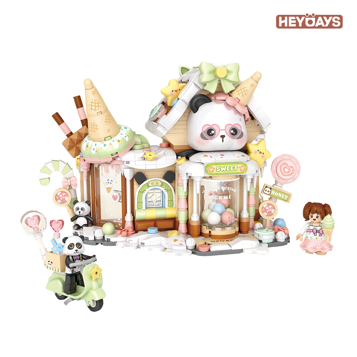 Adorable Panda Ice-Cream Shop display model – Build a pastel “sweet shop” complete with candy-striped columns, waffle-cone roofs, freezer counter, toppings bar, a scooter cart and 2 mini figures (panda vendor + girl). Finished size: 15.5 × 8.5 × 10.5 cm; perfect desk décor or shelf collectible.